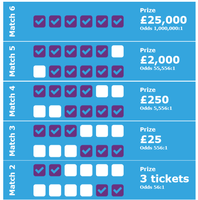 Currently, we have raffle winners each week with the amount won based on the number of tickets sold. With the new odds based structure, you win prizes based on the number of matches you make to the winning combination. There will be a 1:56 chance to win a prize and the prizes are paid no matter how many tickets are sold.